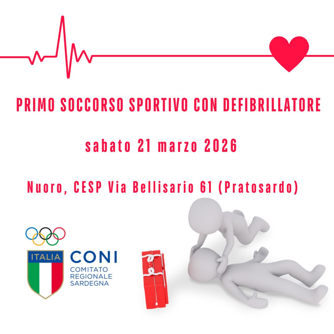 News 23 Feb 2026 Primo Soccorso Sportivo, il 21 marzo un corso PSS-D a Nuoro: dettagli e modulistica Il Coni Sardegna organizza un corso di Primo Soccorso Sportivo con Defibrillatore (PSS-D) che si terrà a Nuoro presso la sede del CESP (Via Marina Bellisario 61, Z.I. Pratosardo), sabato 21 marzo 2026 con orario 08-20. Docenti formatori saranno...